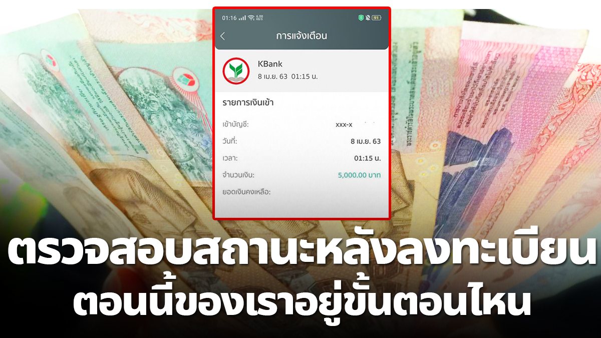 วันนี้ 8 เมษายน 2563 เป็นวันแรกที่มีการเริ่มทยอยจ่ายเงินให้ผู้ลงทะเบียน 5000 ผ่านเว็บไซต์ www.เราไม่ทิ้งกัน.com โดยคนกลุ่มแรกที่ได้รับการคัดเลือก 200,000 บาท จะมีเงินโอนเข้าแล้ว และวันที่ 9 และ 10 เมษายน จะมีคนที่ได้รับเงินอีก ทั้งนี้ ท่านสามารถตรวจสอบวสถานะของการลงทะเบียน เราไม่ทิ้งกัน ดังนี้
